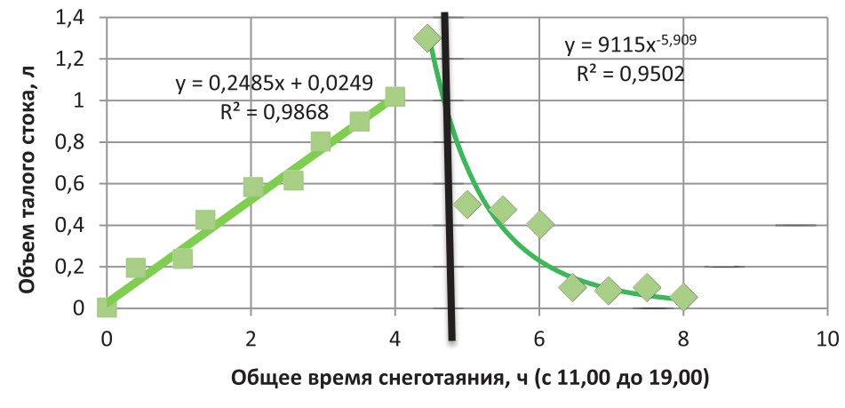 Результаты исследований (до 14.30), показанные на рис. 7, сопоставимы с зависимостями, представленными в трудах [20−22]. Затем (с 14.30 до 20.00) выявлена более ярко выраженная гиперболическая зависимость снеготаяния. Гидрограф снеготаяния имеет степенную функцию (нагрев металла происходит более интенсивно).