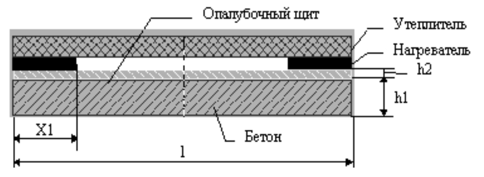 где x1 – ширина нагревателя, м; h1 – толщина бетонной конструкции, м; l – расстояние между нагревателями, м.