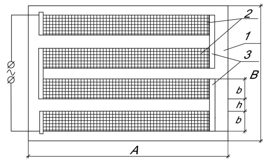 Рис. 2. Схема раскладки сетчатого электронагревателя в греющем устройстве: 1 – палуба устройства; 2 – элементы сетчатого электронагревателя; 3 – коммутационные шины