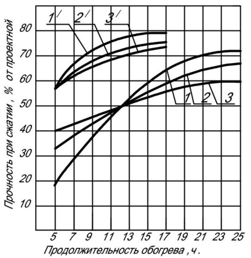 Рис. 3. Характер нарастания прочности бетона (подвижность бетонной смеси 4–6 см) на цементе марки 400 при температуре тепловой обработки 65 °С (1, 2, 3) и 85 °С (1', 2', 3'): 1–1' – на портландцементе; 2–2' – на шлакопортландцементе; 3–3' – на быстротвердеющем цементе