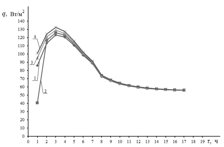 Рис. 4. График изменения теплового потока в процессе термообработки: 1 – для стены толщиной 0,3 м; 2 – для стены толщиной 0,4 м; 3 – для стены толщиной 0,5 м; 4 – для стены толщиной 0,6 м