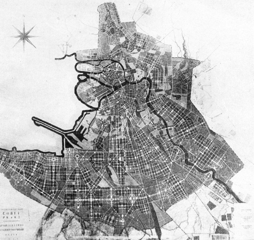 В 1935 г. был объявлен открытый конкурс на эскизный проект планировки Ленинграда. А. И. Наумов вместе со своими однокурсниками А. А. Афонченко, И. В. Мецхваришвили и И. Н. Халиным приняли участие в конкурсе, и их проект был отмечен 1-й премией. В связи с этим им было разрешено взять эту тему в качестве дипломного проекта, и работа была выполнена под руководством проф. В. А. Витмана и доцента В. В. Данилова, работавшего в то время вместе с Л. А. Ильиным (рис. 1).