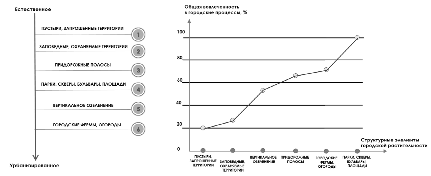 Дальнейшее определение структуры городской растительности (в рамках данного исследования были экспериментально выделены наиболее яркие компоненты: пустыри, болота, заброшенные и неблагоустроенные зеленые территории; заповедные территории, охраняемые зеленые насаждения; придорожные полосы; городские парки, сады, скверы; вертикальное и крышное озеленение; городские фермы и огороды, питомники, палисадники) позволяет классифицировать ее элементы на основе принципа от «природного, естественного» к «преобразованному, урбанизированному» (рис. 3).