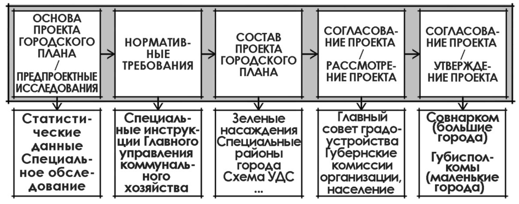 В ноябре 1922 г. в Главном управлении коммунального хозяйства НКВД рассматривался проект декрета о составлении городских планов (рис. 1), в котором были сформулированы требования к содержанию документов, нормируемые показатели, процедура согласования, общая логика построения проектного процесса.