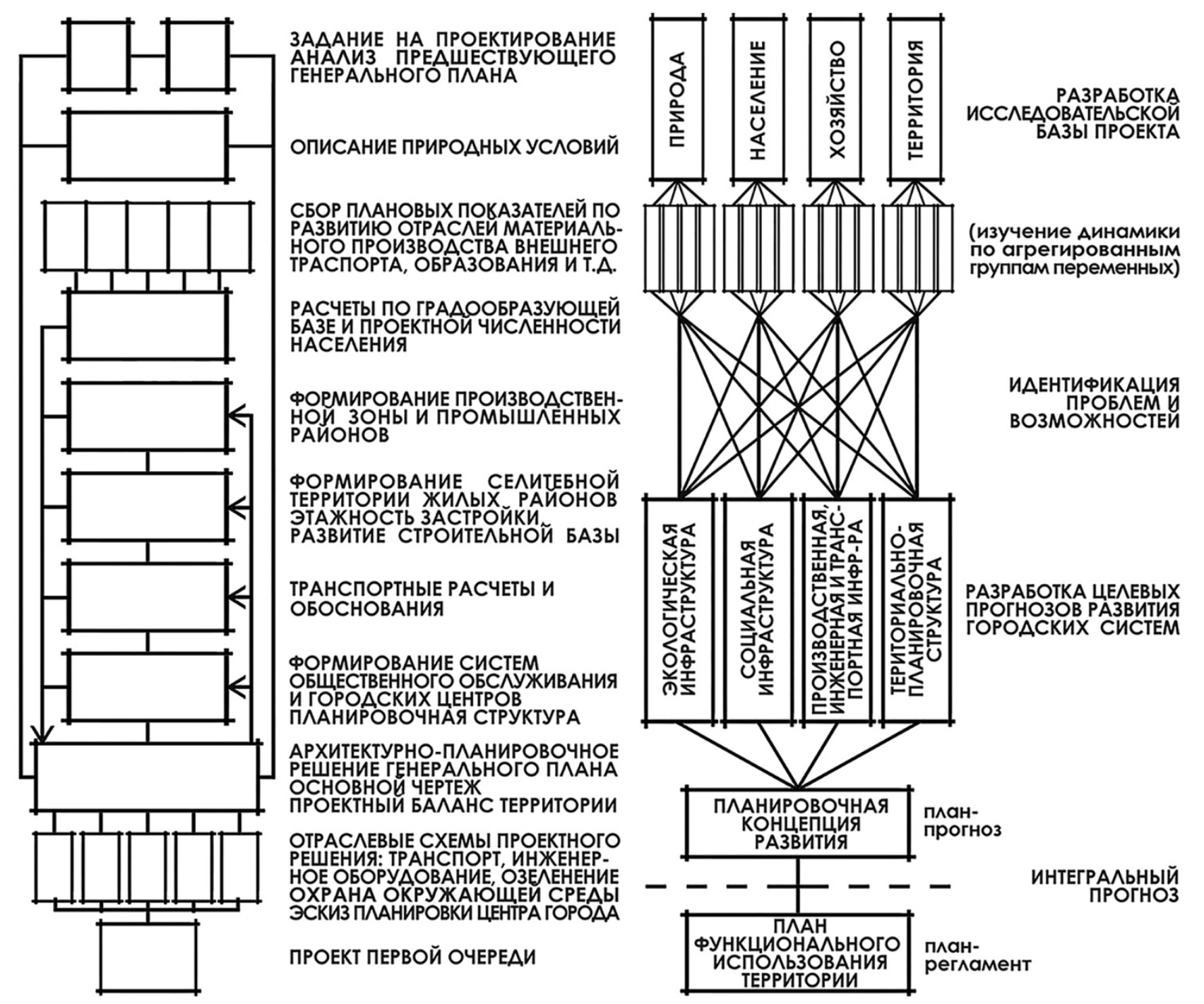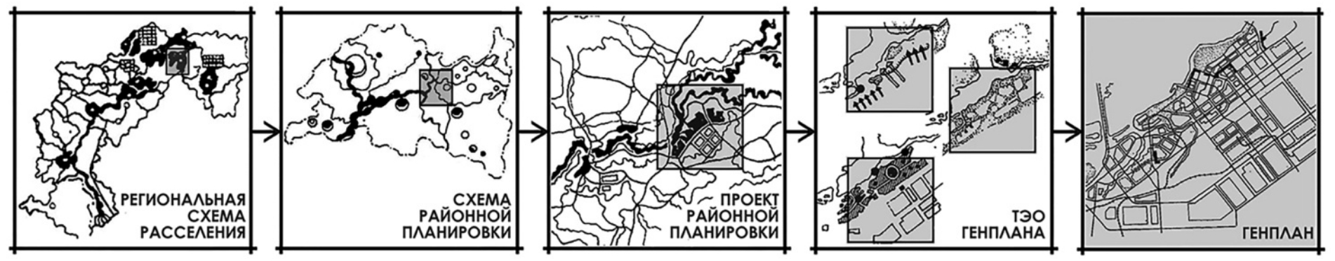 Сводная технологическая схема, описывающая методику проектирования (рис. 6) нового города от уровня системы расселения до этапа реализации проекта на начало 1980-х, выглядела следущим образом.