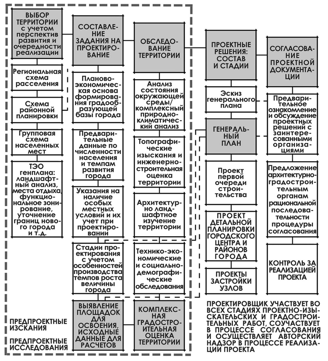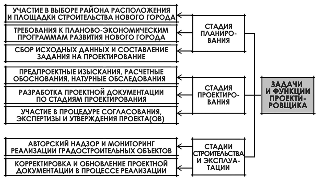 Согласно методическим рекомендациям, задачи и функции проектировщика включали в этот период не только проектные работы, но и стадию планирования и предпроектные изыскания (рис. 3).