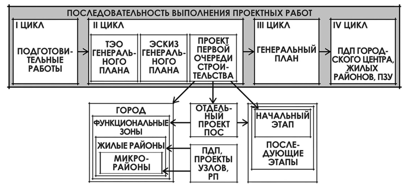 Рис. 6. Технологическая схема подготовки градостроительной документации (составлено авторами по материалам Руководства по проектированию новых городов, 1982 г.) [9]