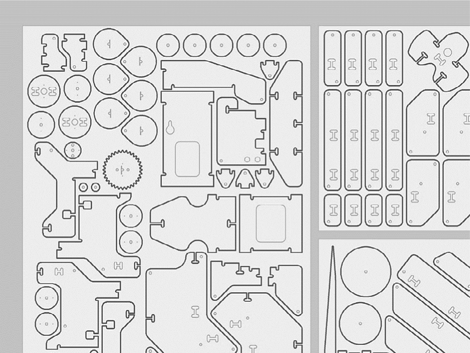 Для раскроя фанерных и стальных деталей подготовлены специальные выкройки в векторном формате (рис. 3), а для установки двигателей и аккумуляторов разработаны и изготовлены на 3d-принтере специальные пластиковые детали.
