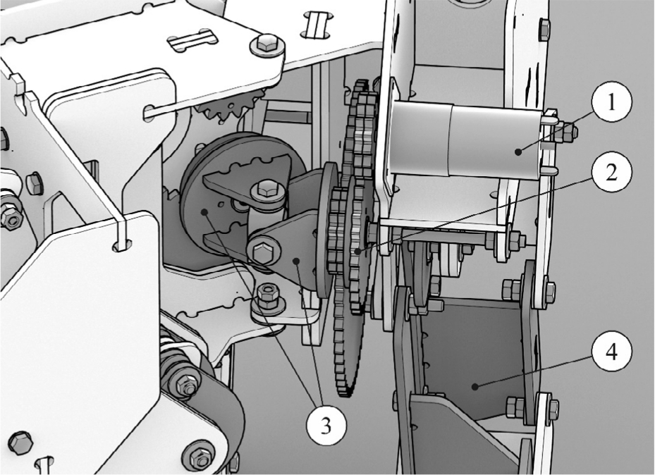 Рис. 4. Соединение карданного вала с двигателем: 1 – электродвигатель; 2 – система зубчатых колёс; 3 – элементы карданного вала; 4 – нога шагающей модели