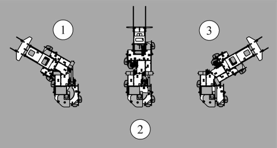 Максимальный угол отклонения передней части относительно задней составляет 60 град влево и 60 град вправо. На рис. 5 показаны три базовых режима движения шагающей модели: 1) максимальный поворот влево, 2) движение прямо, 3) максимальный поворот вправо.
