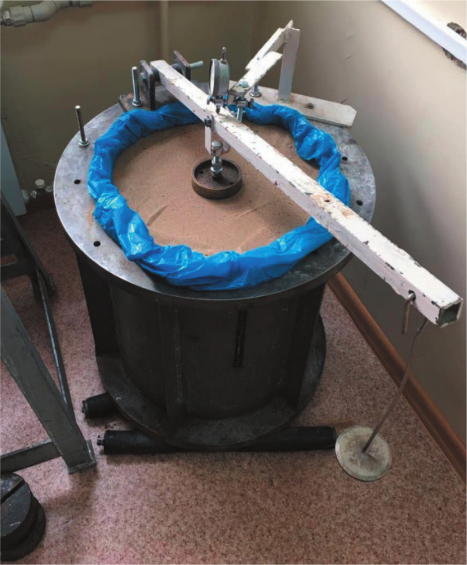 Pressure on the experimental soil was transmitted in steps by a round metal stamp with an area of 60 cm2 by placing weights of 3 kg on a vertical suspension of the lever system, creating a pressure of 0.01 MPa under the stamp [6]. Each subsequent load stage was performed after the complete attenuation of the sediment from the previous stage. The increase in load continued until the increase in soil deformation from the newly applied load exceeded the deformation level from the previous stage by more than five times. The magnitude of soil deformation was recorded using a dial indicator (deflectometer) with a division value of 0.01 mm.