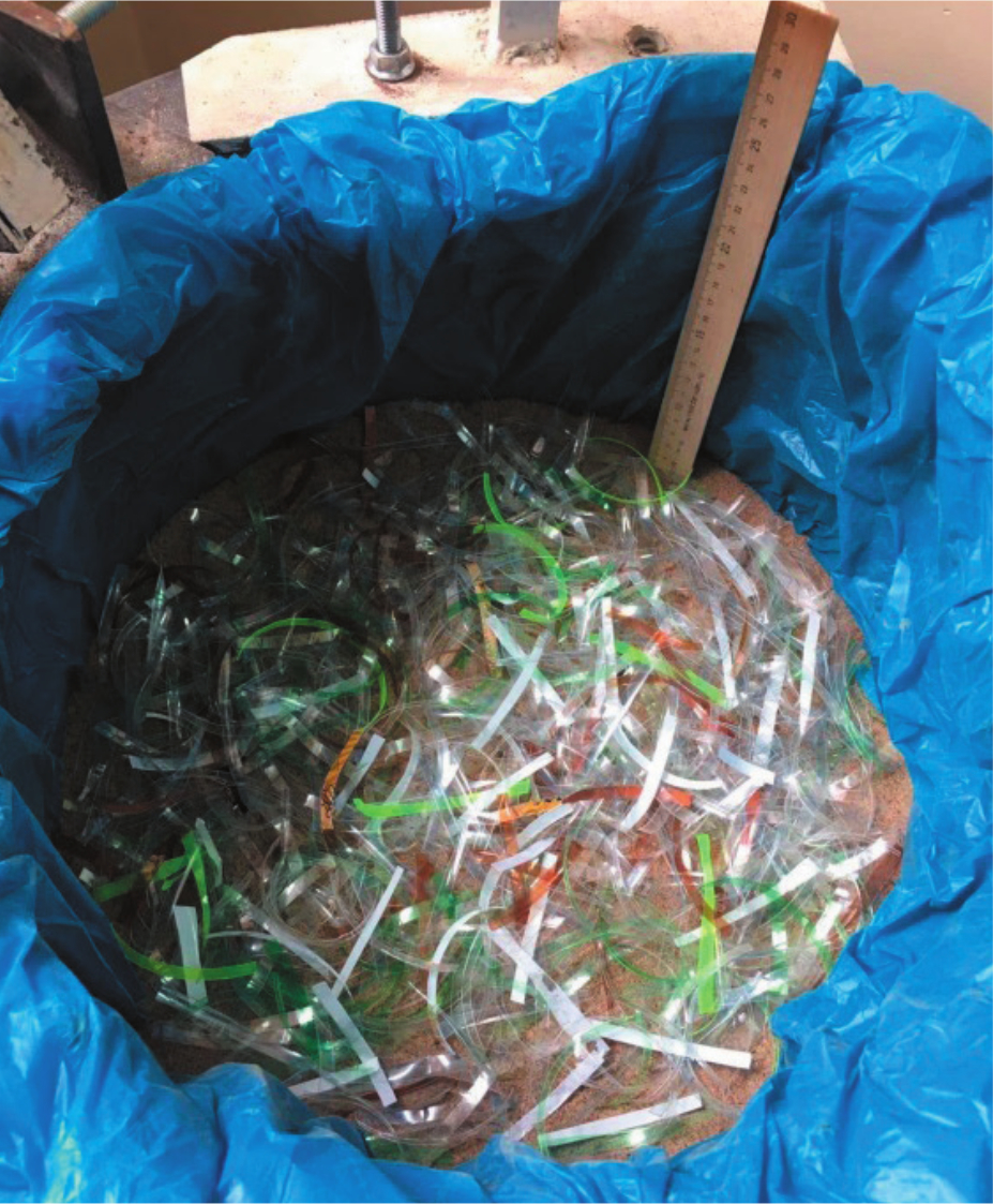 In construction, plastic waste can be used as thin strips for dispersed reinforcement of artificial foundations, which partially replace the thickness of weak natural soils with low physical and mechanical characteristics, or when filling areas to raise the relief to design elevations [1, 2]. Notably, reinforcement of artificial foundations in Russia has been implemented for more than 30 years, and geotextiles or geogrids produced specifically for these purposes are used in most cases, for e.g., rolled materials or flat frames [3, 4]. As such, no attempts to produce dispersed reinforcement of soils were noted; accordingly, a series of experiments were performed in this regard.