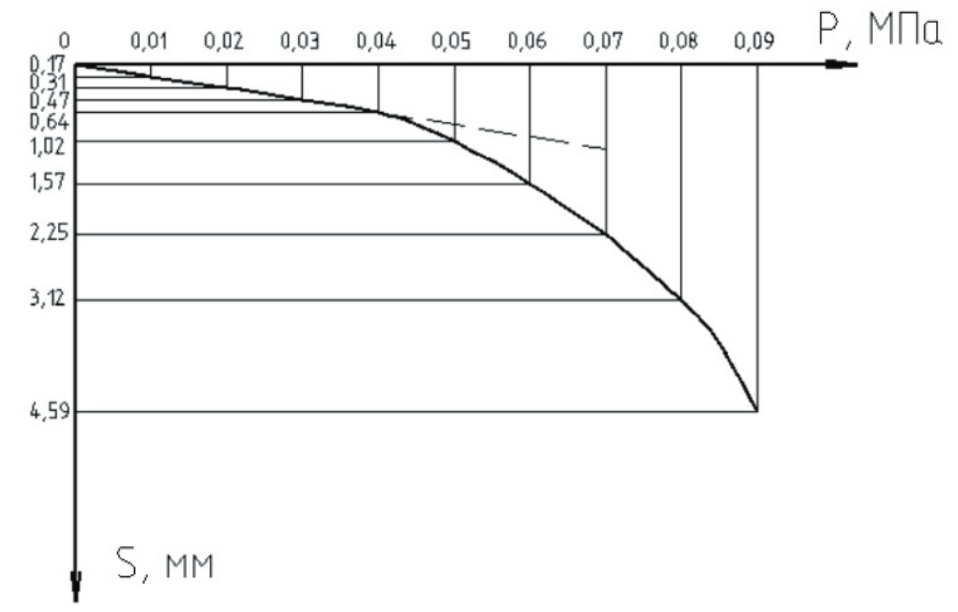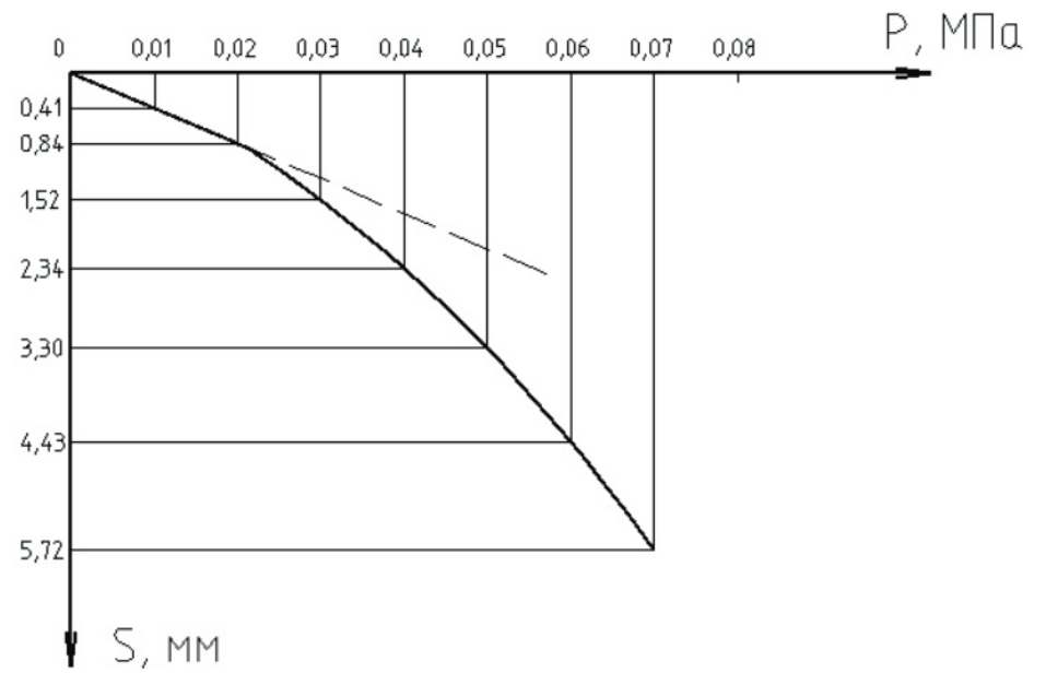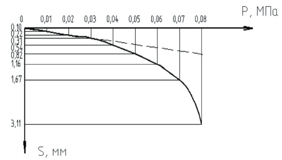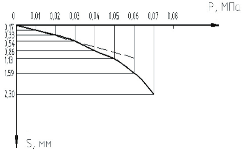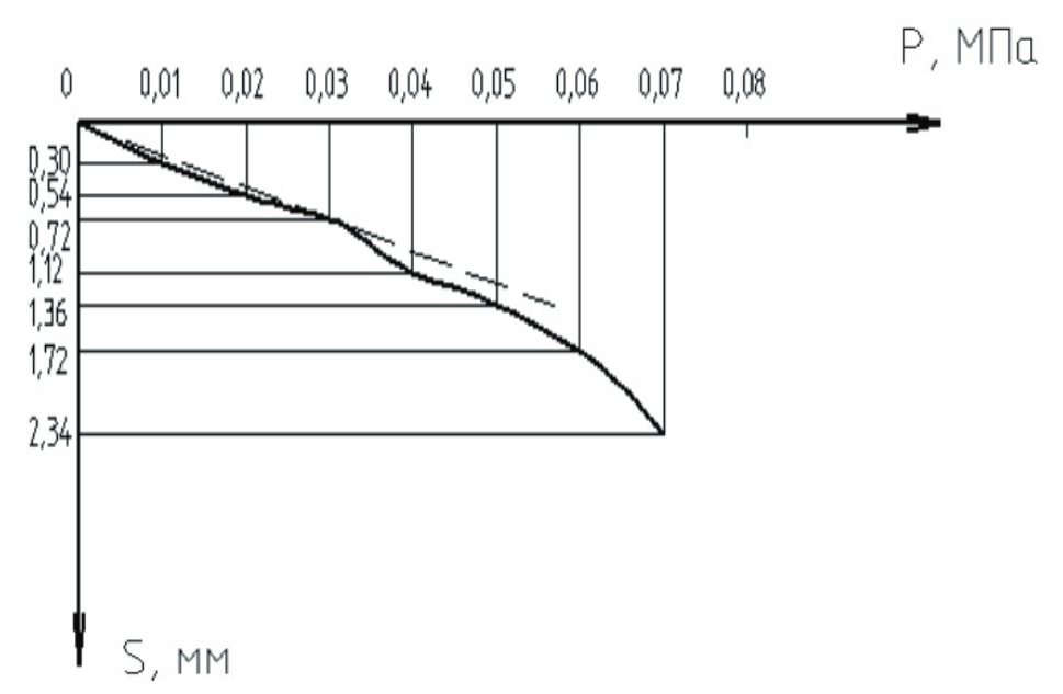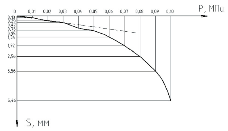 Fig. 7. Graph of dependence of stamp settlement on load when testing soil without reinforcement