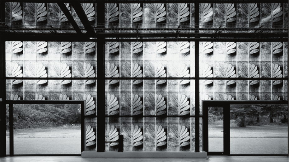 В производственно-складском здании для Ricola Europe (Мюлуз, Франция) Герцог и де Мерон решили использовать технику шелкографии (рис. 7). Они выбрали изображение листа, сделанное знаменитым фотографом XIX в. Карлом Блоссфельдтом, которое привлекло их тем, что соединяло в себе качество фигуративного и абстрактного. Изображение было напечатано на полупрозрачных поликарбонатных панелях и растиражировано подобно сериям Энди Уорхола. Изменения в освещении, различные погодные явления, ракурсы накладывают свой отпечаток на эти панели, которые создают то, что архитекторы называют «чувственным физическим присутствием» [17]. Изображения начинают «работать» в процессе движения зрителя, создавая неожиданный пространственный и визуальный эффект. Архитекторы определяли этот эффект как ключевое качество стены, служащей границей между природным и промышленным пространствами.