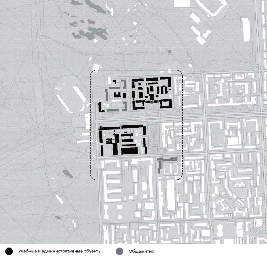 Кампус вуза понимается как комплекс объектов, связанных доминирующей научно-образовательной функцией. Комплекс включает учебные, научно-исследовательские, административные и жилые здания, а также объекты спорта, инфраструктуры обслуживания и рекреационные пространства. Кампус высшего учебного заведения – многофункциональный комплекс зданий, предназначенный для размещения подразделений вуза, связанных системой особых общественных пространств, формирующих единую среду для высшего образования, научных исследований, а также широкого спектра сопутствующих функций в системе «труд-быт-отдых» всех уровней для участников данных процессов [1].