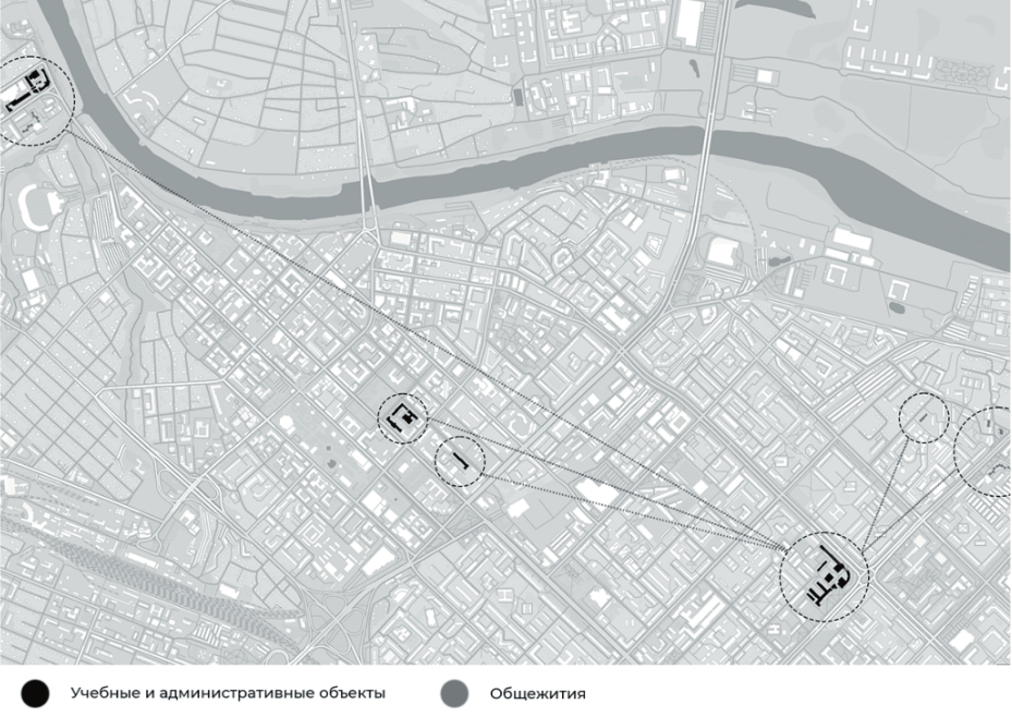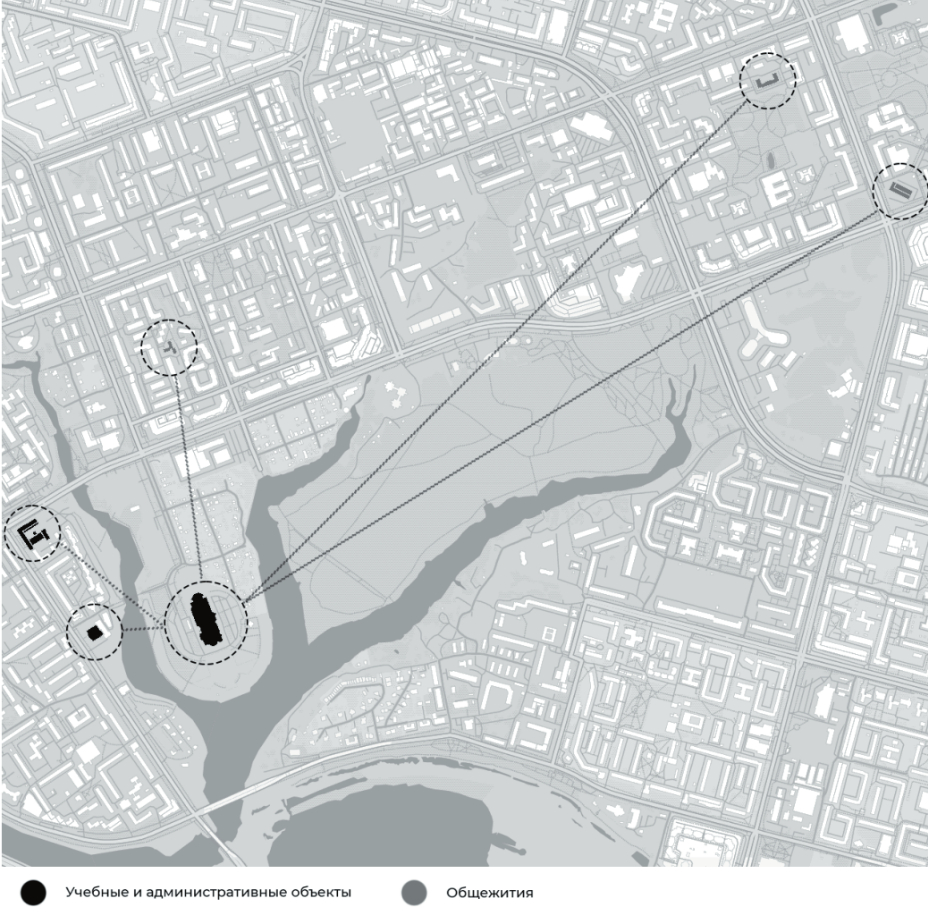 В реальной практике представлены различные сочетания типов архитектурно-градостроительного размещения кампусов. Например, кампус Уральского федерального университета (УрФУ) имени первого президента России Б. Н. Ельцина, г. Екатеринбург – сочетает элементы компактного и рассредоточенного типов (рис. 8).