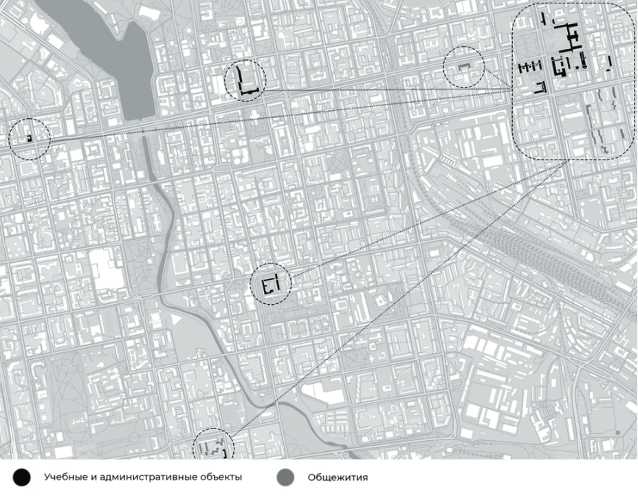 Для формулирования предложений по развитию существующих кампусов вузов проанализированы различные типы архитектурно-градостроительного размещения в структуре поселения.