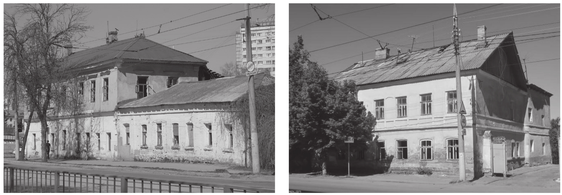 Наряду с проблемами точечной застройки в городе достаточно остро стоит вопрос значительного объема неиспользуемых зданий и сооружений. К ним можно отнести множество разрушенных жилых домов, в том числе объекты культурно-исторического наследия. Это усадьба Фомичевых на улице Октябрьской, построенная в начале XIX в., дом Ф.И. Лобанова (ул. Старо-Московская, построен в 1881 г.) и дом А. Сырцевой (ул. Карачевская, построен в 1862 г.) (рис. 3). Несмотря на то, что эти здания являются исторически ценными объектами, они существенно искажают восприятие горожанами архитектурно-пространственной среды города.