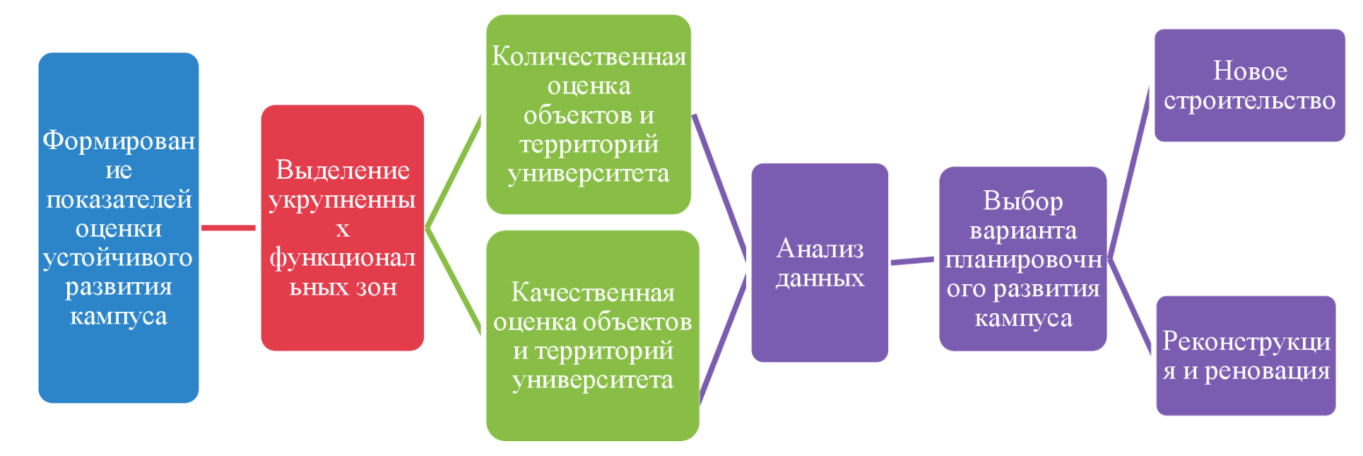 Herein, all works were based on a systematic approach. A campus was considered a complex holistic system. The principle of analyzing the interrelationships of environmental, economic, and social factors of sustainable development was fundamental in determining the necessary objects and zones that are part of the campus territory. Accordingly, the criteria for assessing existing campus areas and compliance with the required level were determined.