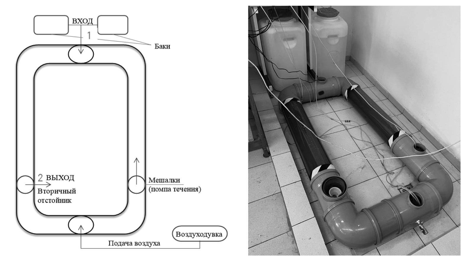 Достаточно протяжённые коридоры исследуемой модели ЦОК позволили создать градиент растворенного кислорода по длине. Общий объем установки составлял 144 л. Аэрация ЦОК обеспечивалась мелкопузырчатыми аэраторами, расположенными в точке после отвода воды на вторичный отстойник. Кольцевое движение потока жидкости обеспечивалось погружными мешалками с регулируемой частотой вращения. Подача исходной модельной жидкости осуществлялась насосами-дозаторами из емкостей.