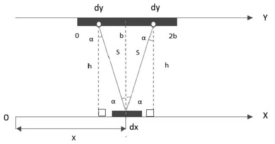 - отсчет расстояния «у» будет вестись от левого края излучателя (у = 0), в середине излучателя (y = b), в правом крае излучателя (y = 2b).
