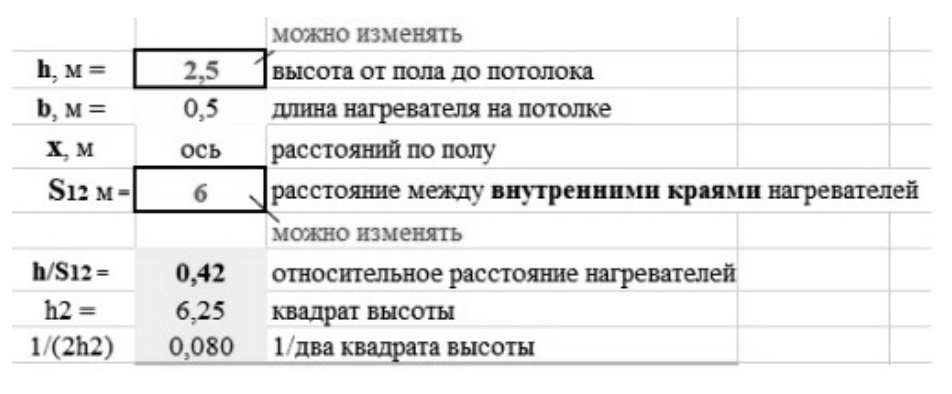 На схеме (рис. 5) отмечены все параметры исходя из архитектурно-строительных характеристик здания, взаимного расположения излучателей на потолке и распространения тепловых потоков. В соответствующие ячейки задаются значения параметров: высота помещения, длина излучателей, расстояние по поверхности пола.
