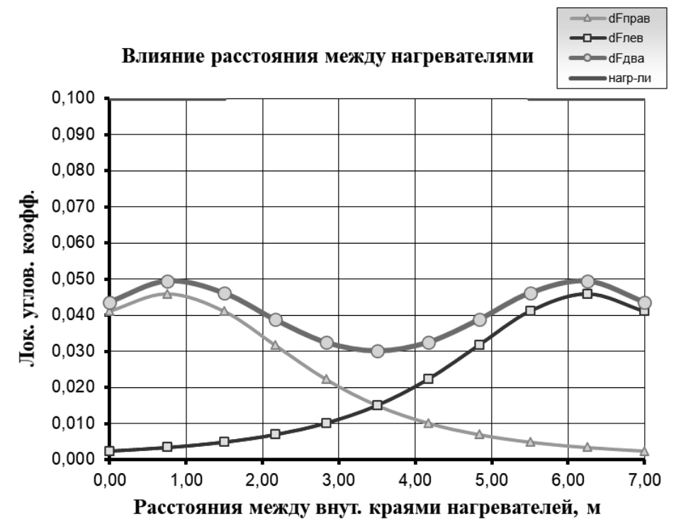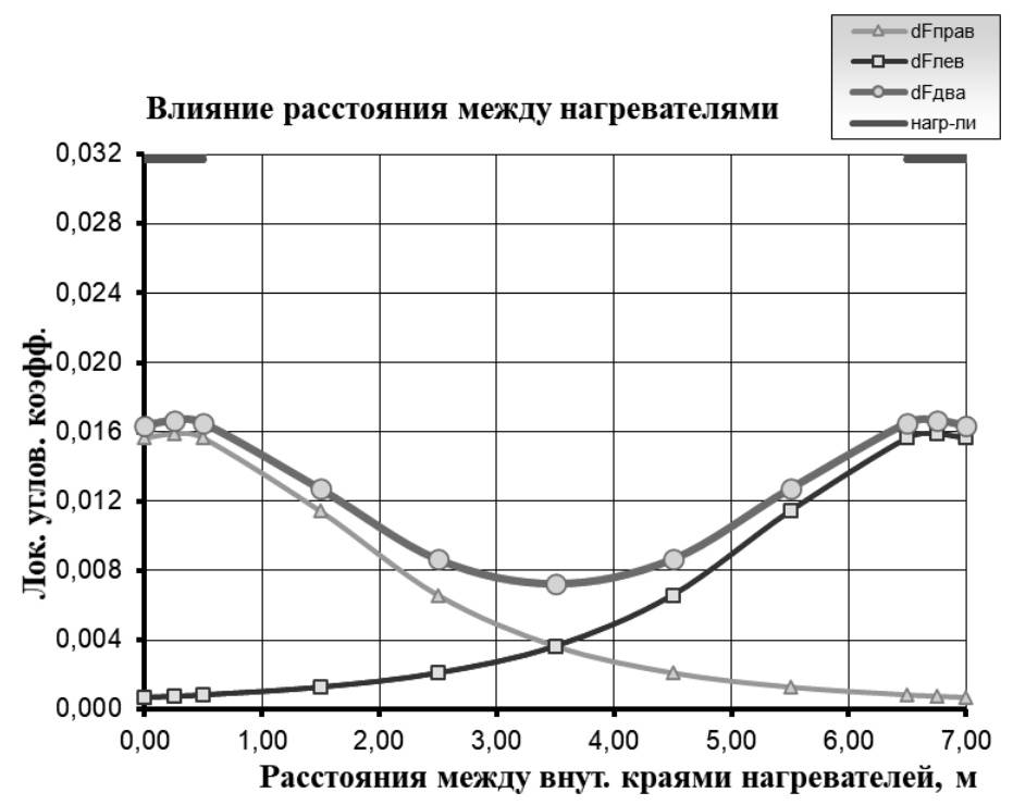 Рис. 7. Влияние расстояния между нагревателями на тепловой поток от излучателей