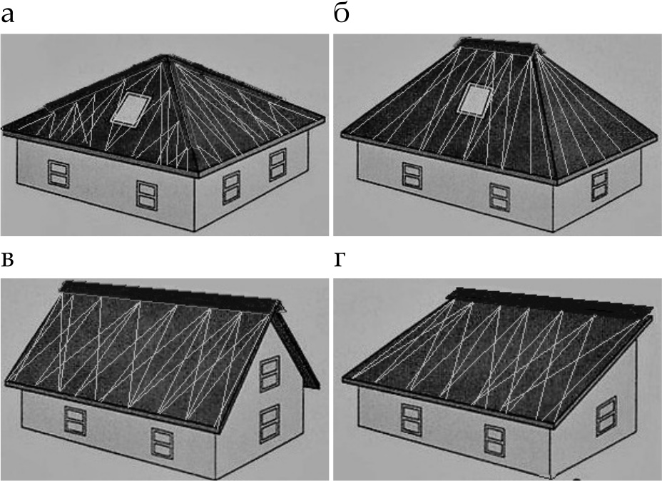 Рис. 3. Общий вид устройств снегоочистки, укрытых защитным козырьком в тон кровле и зоны обслуживания струями скатных кровель некоторых типов: а – шатровая; б – вальмовая; в – двускатная; г – односкатная