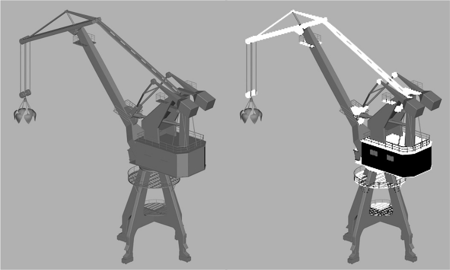 В правой части рис. 4 показано разделение сборных элементов портового крана. В сооружениях такого рода критически важна устойчивость объекта. Может показаться, что ассоциативное сходство с каким-либо животным проектировалось дизайнером, но это не так. Форма объекта приобрела такой вид преимущественно в ответ на функциональные, технические и нормативные ограничения, которые стояли перед инженером. Вместе с тем у портового крана присутствуют элементы, которые существенно отличаются у различных моделей, что, конечно, свидетельствует о наличии некоторой свободы в принятии решений («формы ограниченного выбора», выделены белым). В действительности дополнить облик портового крана дизайнер может, но только разрабатывая интерьер и экстерьер кабины и машинного отделения («форма свободного выбора», выделена чёрным).