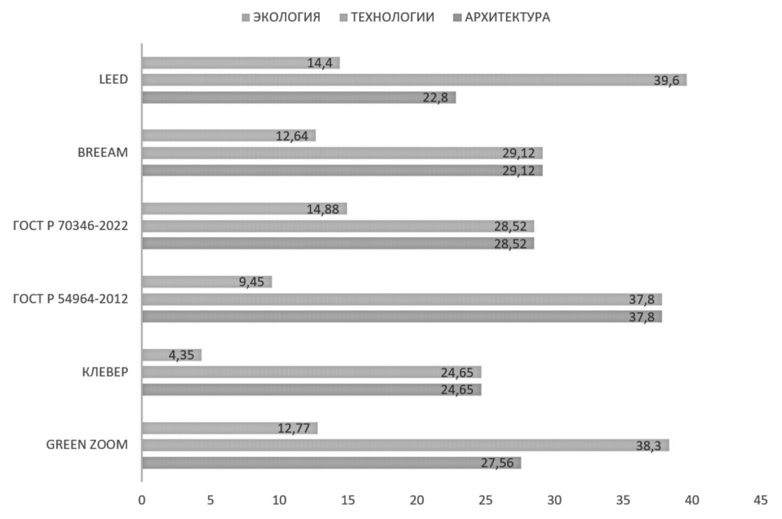 - При сравнении выявленных значений между собой определено, что международные и российские системы практически в равных долях уделяют внимание архитектурным и технологическим аспектам при сертификации. Наименьшее количество критериев по экологии и охране окружающей среды.