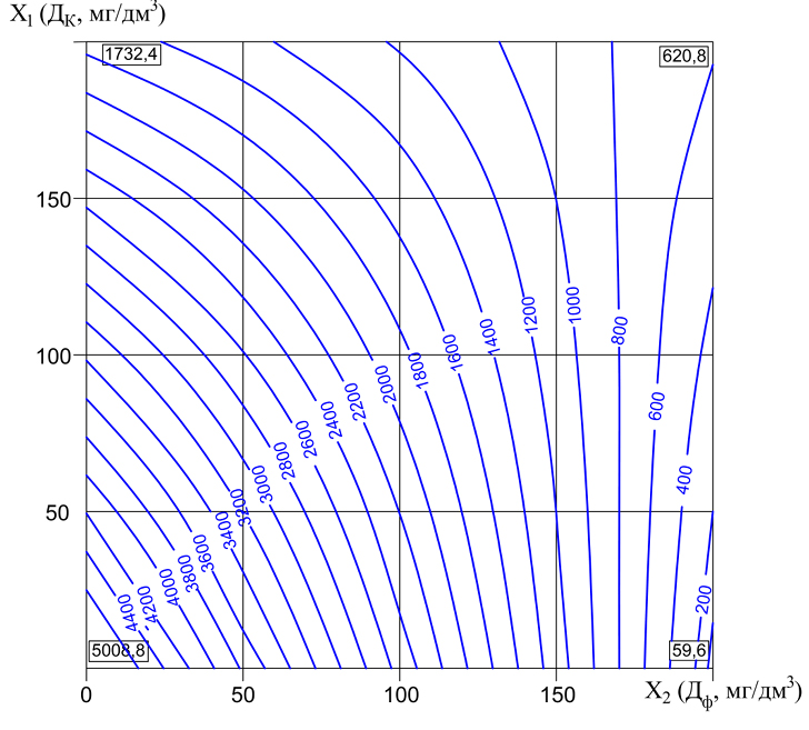 Рис. 2. Изолинии зависимости изменения удельного сопротивления исследуемого осадка r·10-10, см/г, от доз реагентов Дк = 100–300 мг/дм3 и Дф = 100–300 мг/дм3