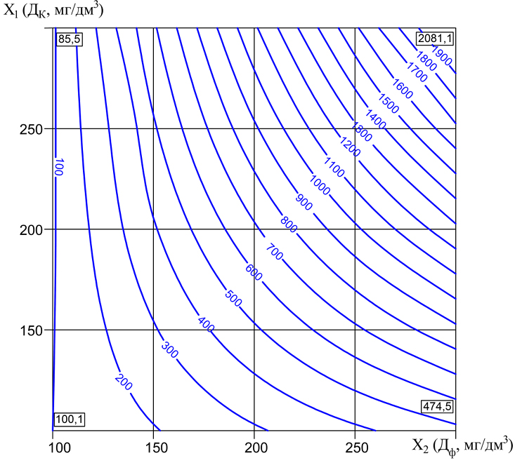 Fig. 2. Isolines of the dependence of the change in the resistivity of the studied sediment r·10-10 cm/g, from reagent doses Dk = 100‒300 mg/dm3 and Df = 100‒300 mg/dm3