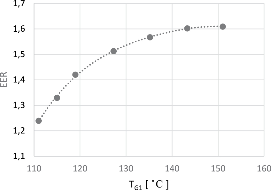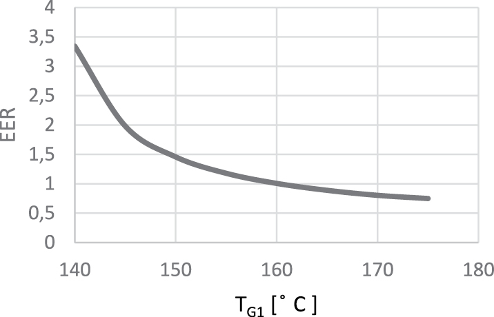 Таким образом, для наибольшего эффекта проектирование должно осуществляться для температуры, соответствующей более высокому значению EER, и температуры, далекой от явления кристаллизации. Поэтому наиболее оптимальной будет схема при проектировании с температурой основного генератора 130 °C, что далеко от температуры кристаллизации и обеспечивает наибольшее соотношение температур 1,52 и эффективность 0,225.
