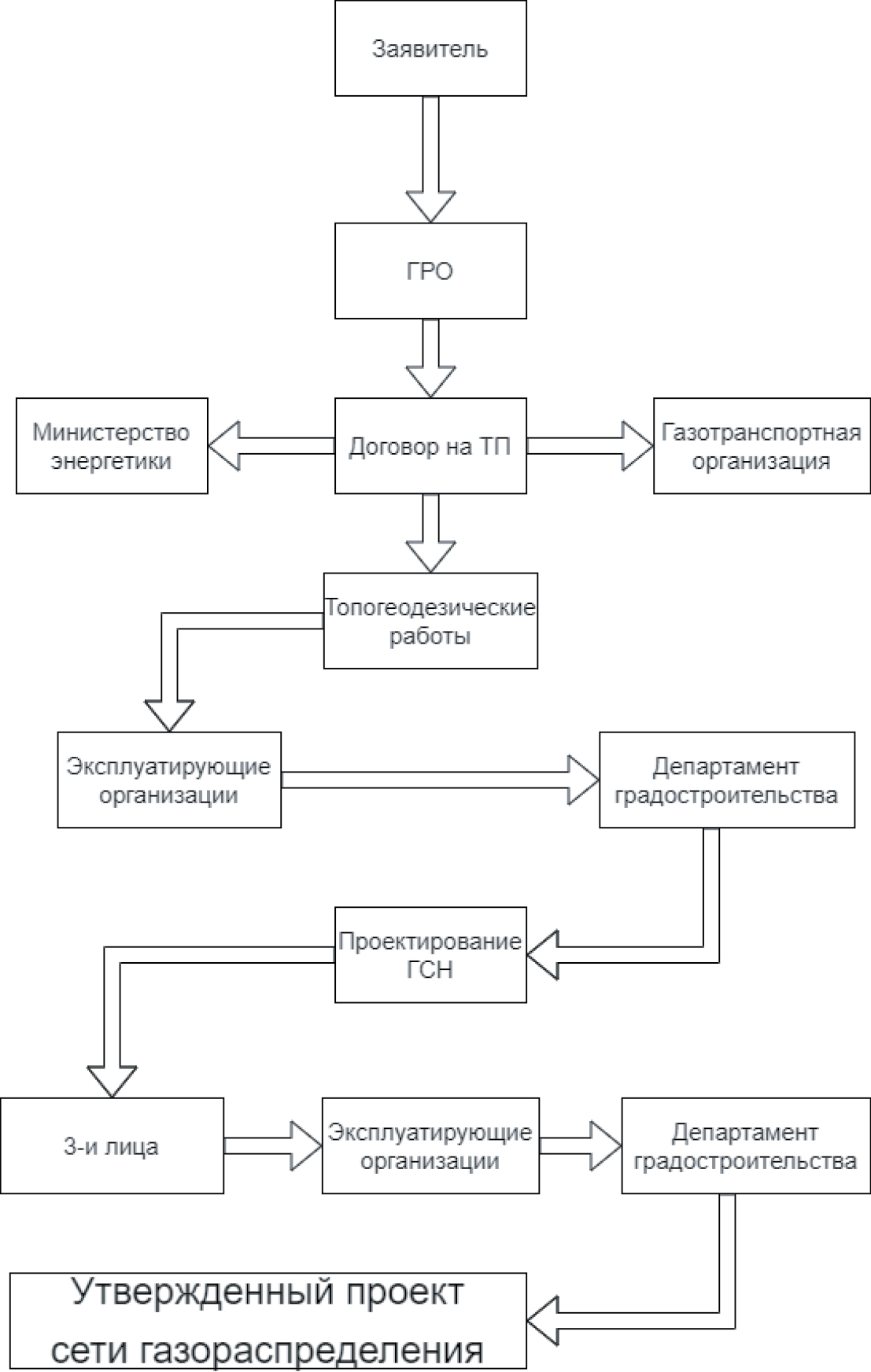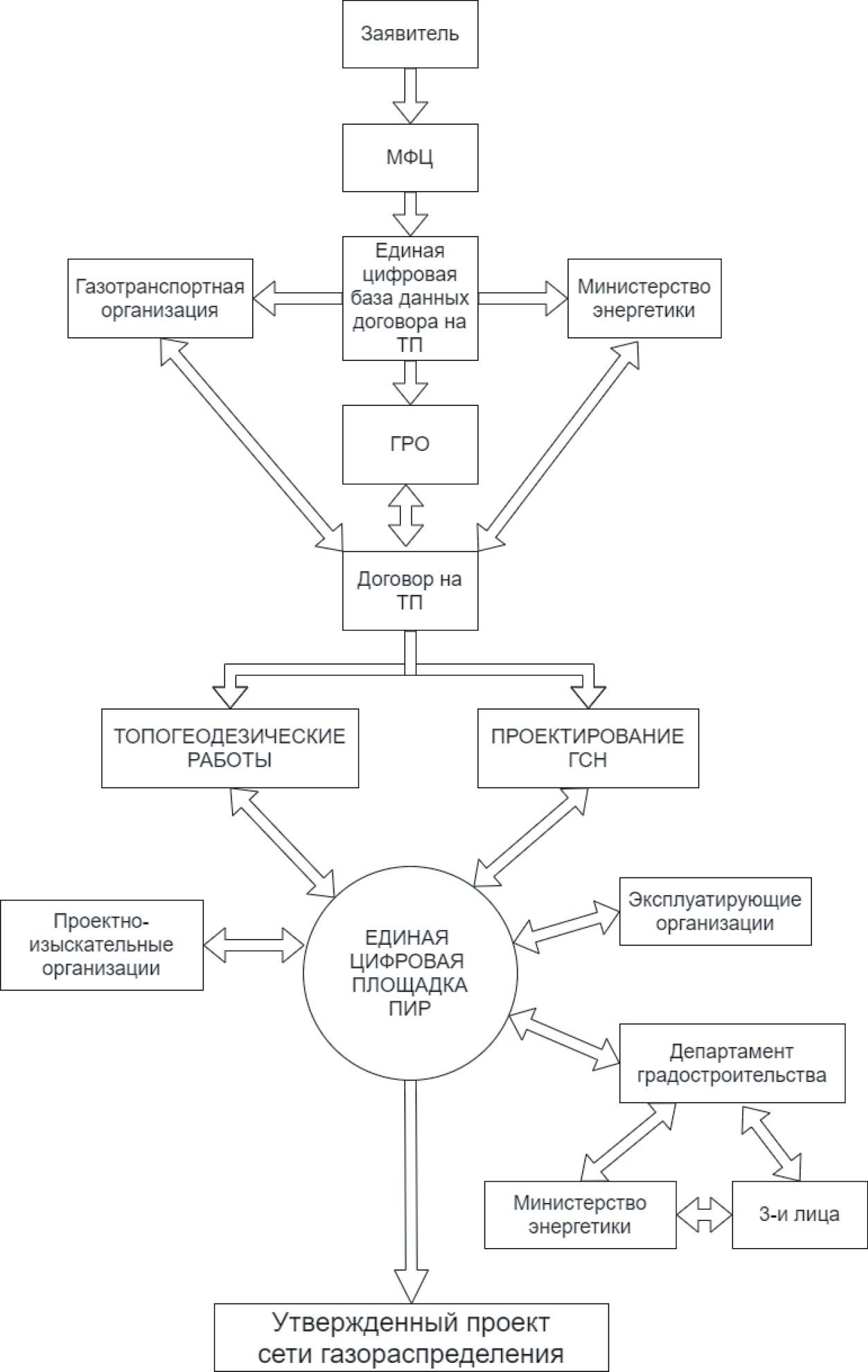 Далее силами ГРО производится анализ возможности подключения объекта капитального строительства заявителя в соответствии с запрашиваемым расходом газа к сети газораспределения и определяется точка подключения. Эти данные являются определяющими показателями при составлении договора на технологическое подключение и дальнейшее его заключение между ГРО и заявителем. После заключения договорных обязательств по подключению объекта капитального строительства к сети газораспределения силами ГРО проводятся изыскательские и проектные работы. В этом процессе задействованы Департамент градостроительства, эксплуатирующие организации и третьи лица, чьи интересы затрагиваются в процессе строительства сети газораспределения.