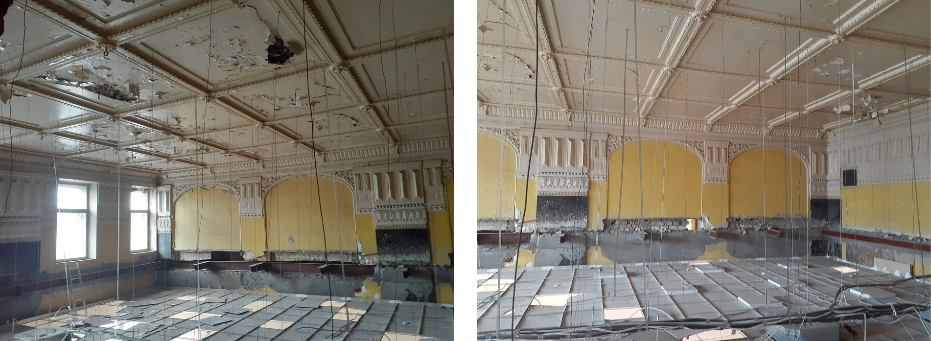 Кассетированные потолки ресторана хорошо сохранились и могут быть восстановлены (рис. 8). Остальные декоративные элементы ресторанного зала также могут быть восстановлены (пилястры, фриз, декоративные балкончики). Однако существовавшие в уровне второго этажа четыре сквозные арки заложены и их раскрытие может нарушить целостность конструкции. Рекомендуется их оставить в виде ниш.