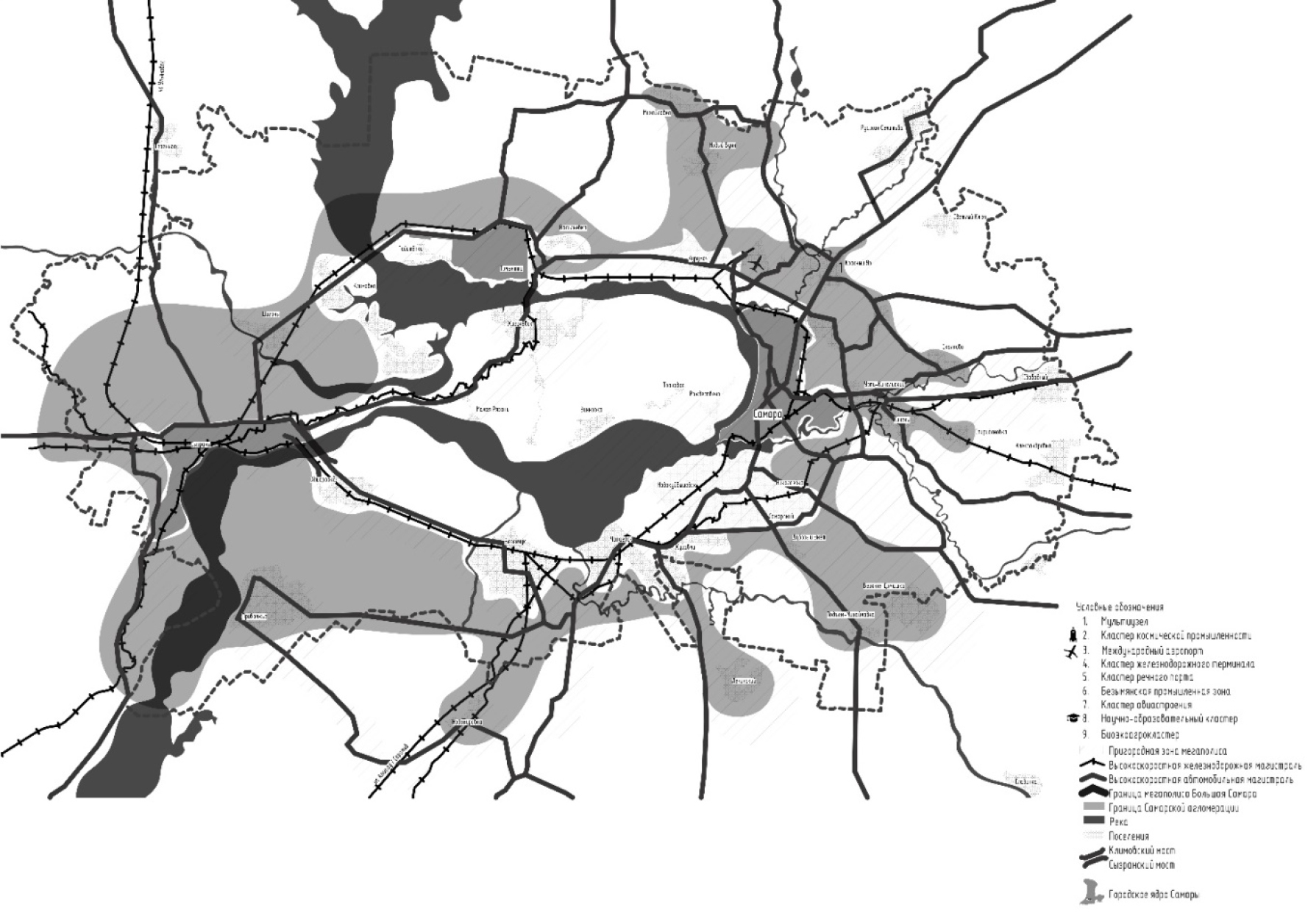 В современной мировой экономике товаропроводящий транзитный потенциал оценивается как наиболее эффективная форма грузопассажирского обмена. Транзитный и промышленный потенциал России способен создать мощную конкуренцию мировым транспортным корпорациям. Формирование терминально-складской инфраструктуры в Самарском транспортном мультиузле позитивно отразится на всех экономических отношениях Самарского региона. Создание транспортно-логистического кластера с дополнительными многофункциональными включениями позволит укрепить институты предпринимательства и государственного управления, используя параллельно горизонтальную и вертикальную структуры управления. Автором предлагается теоретическая модель полицентрической структуры пригородной зоны мегаполиса Большая Самара (см. рисунок), в которой роль центров выполняют мультиузлы.