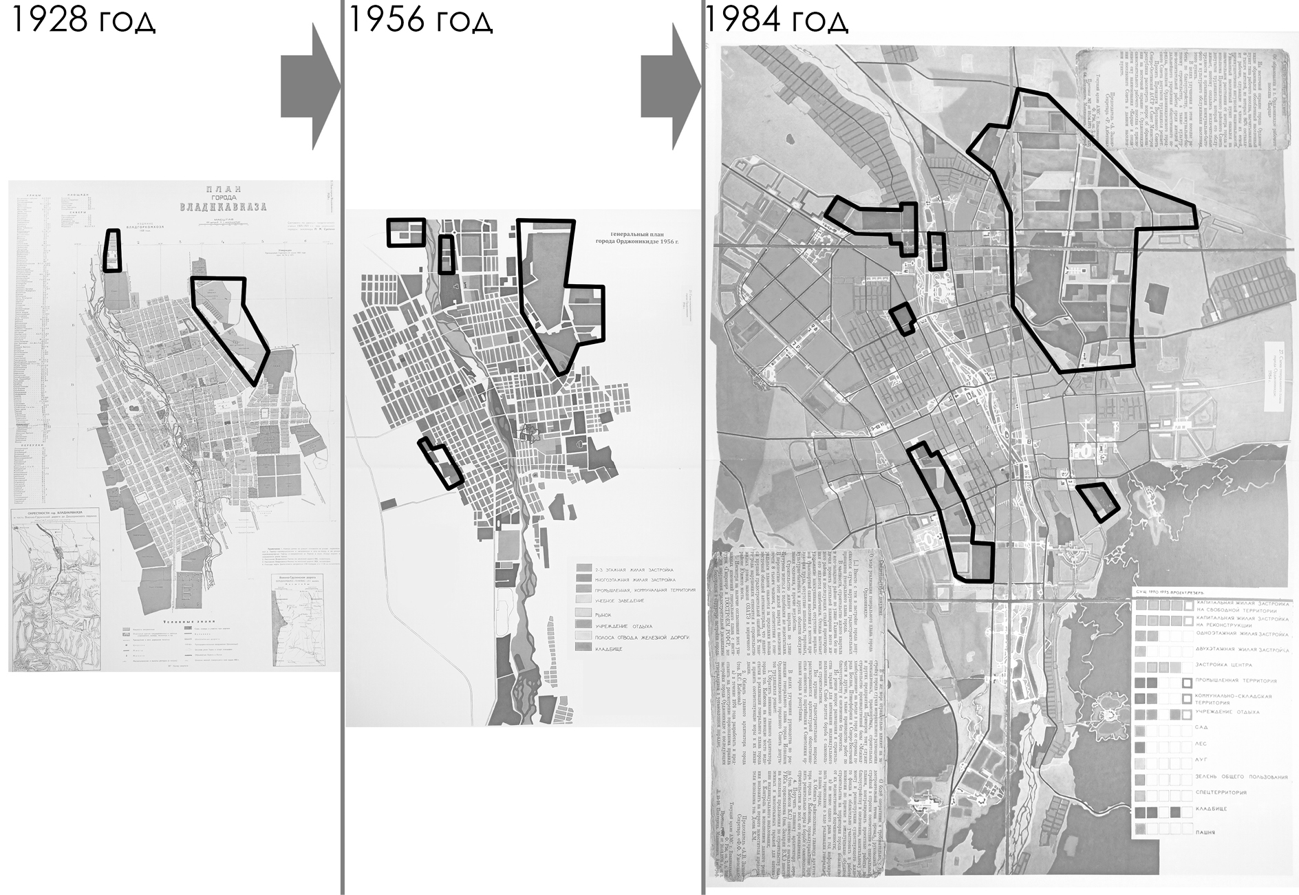 Dynamics of spatial development of industrial zones in Vladikavkaz. Plans for 1928, 1956, 1984. Industrial zones are highlighted in black