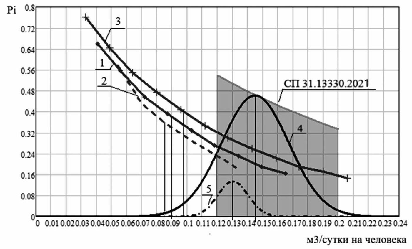 Fig. 2. Graphs of differential distribution density functions within the specific water consumption range recommended by SP 31.13330.2021: 1 – the Marat-5 microdistrict in Kerch; 2 – microdistrict “Marat ▪ 4” Kerch; 3 – microdistrict “Marshal Zhukov – a village of deported peoples” Simferopol; 4 –microdistrict “Marshal Zhukov – multi-storey residential building” Simferopol; 5 – a group of 8 MKDs on the street. October city of Alushta
