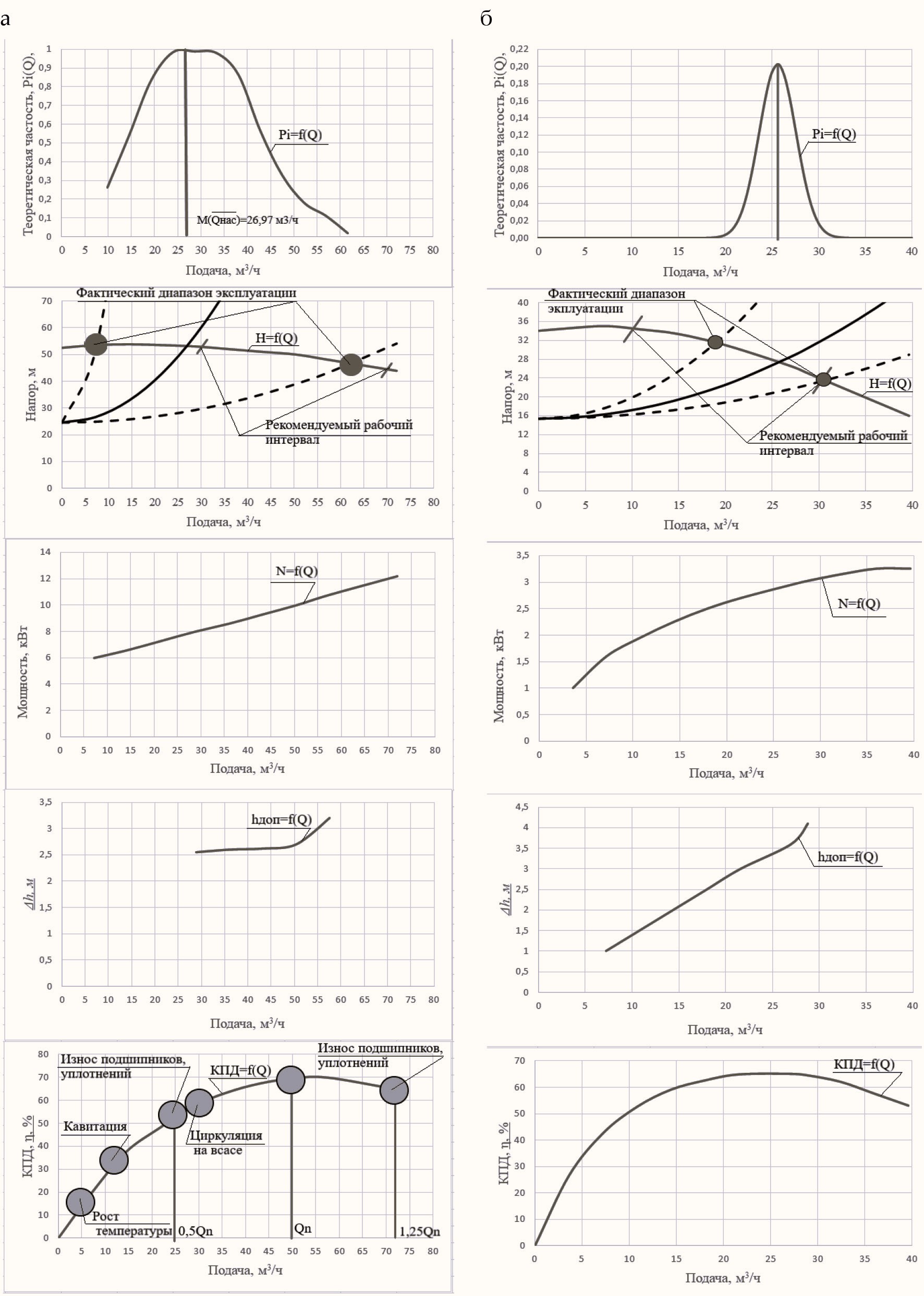 Следующим этапом оценки являлся переход к определению эксплуатационных параметров насосного оборудования, работающего на соответствующий гидравлический контур. Энергетические характеристики насосов представлены на рис. 3.