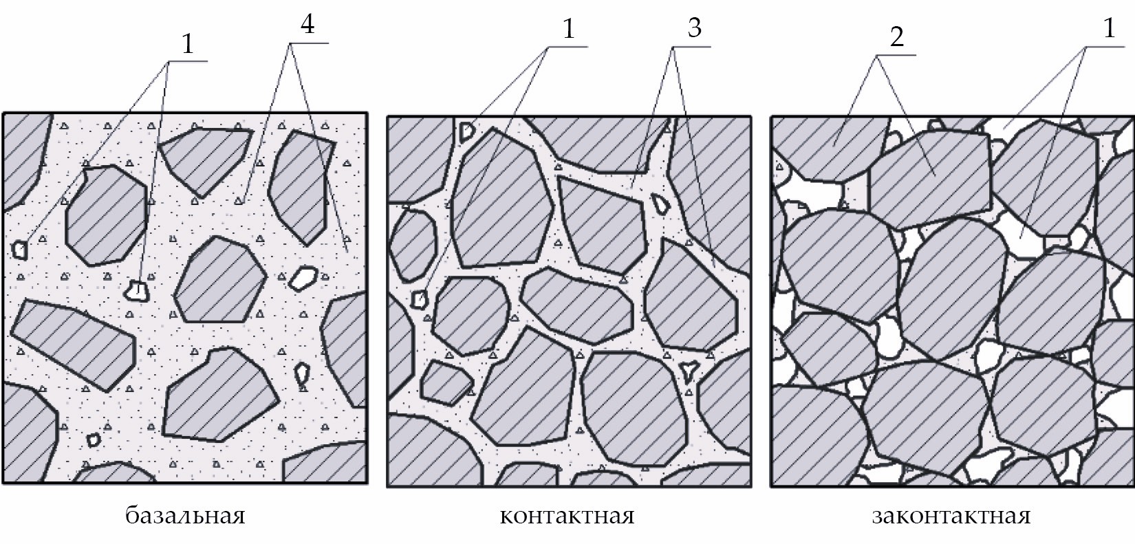 Fig. 1. Types of concrete structures depending on the change in crushed stone content: 1 – intergranular voids; 2 – crushed stone grains; 3 – is an adhesive layer; 4 – cement matrix