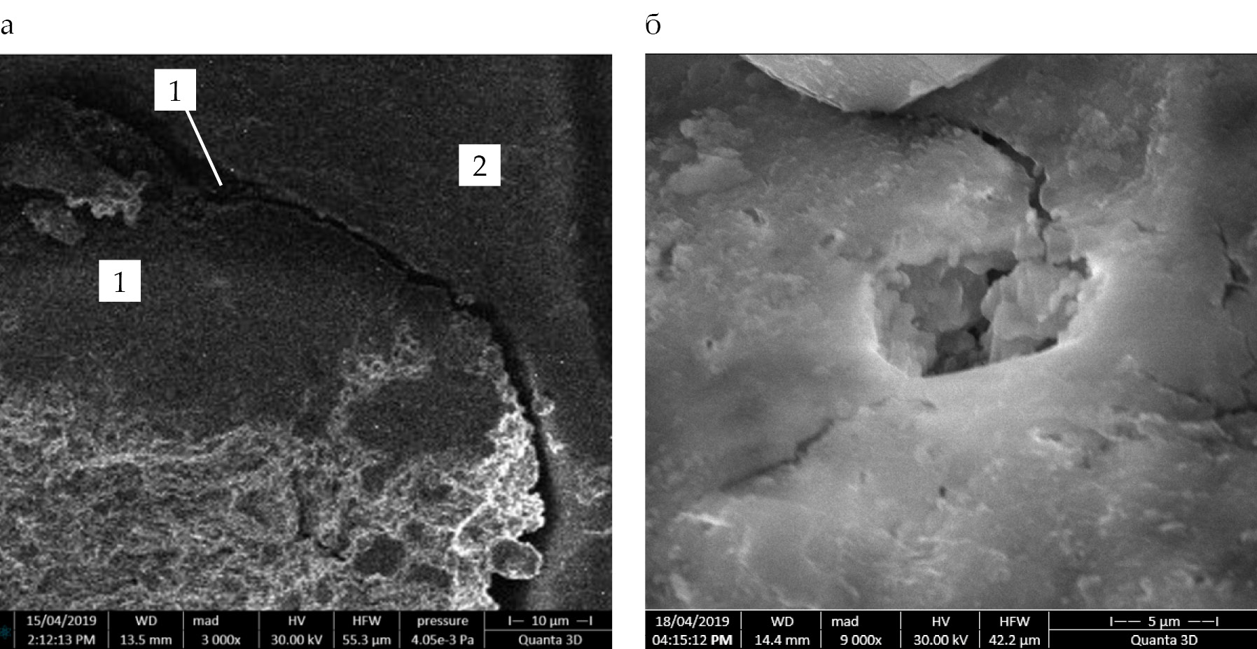 Ввиду того, что от показателя адгезионной прочности в зоне контакта цементно-песчаного раствора и поверхности крупного заполнителя зависят физико-механические показатели бетона в целом, образцы состава В40 подвергались микроанализу на растровом электронном микроскопе Quanta 3D 200i с интегрированной системой микроанализа Genesis Apex 2 EDS от EDAX. На приведенных микрографиях (рис. 2) образцов бетона можно наблюдать морфологию контактной зоны и достаточно плотную структуру композита.