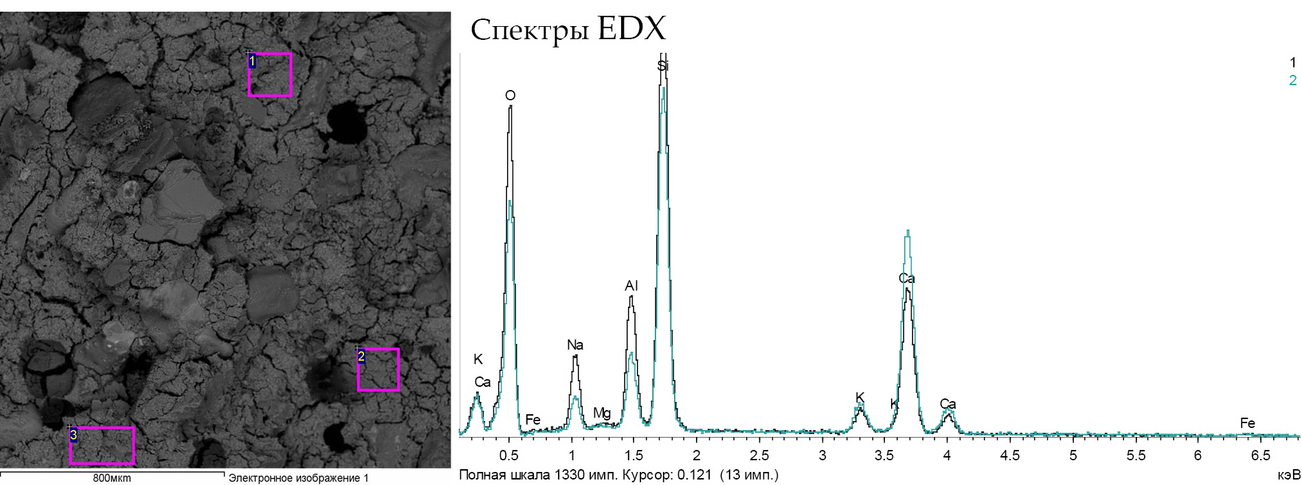Рис. 3. Состав типичных участков (спектры EDX) (увел.800 мкм)