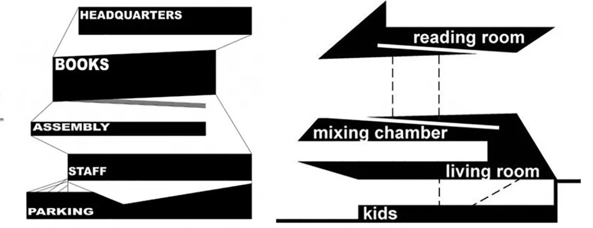 Социальный конденсатор у Колхаса не является банальным многофункциональным зданием. Есть несколько проектов, когда отдельная типология рассматривается через призму новой программы, адаптированной к современным условиям. Таким объектом стала Центральная библиотека в Сиэтле (2004 г.) (рис. 2), где традиционный тип был подвергнут переосмыслению: в новых условиях цифровой трансформации библиотека может выжить только если превратится в общественное пространство, создающее возможности работы, исследования, общения для различных социальных и возрастных групп. Так появился новый тип программы библиотеки, в которой на функциональном и пространственном уровне был достигнут баланс специфичного и неопределенного. Архитектурная концепция библиотеки основана на образе небоскреба с его дифференцированными пространствами и свободой, достигаемой за счет коммуникаций. Пять платформ гарантируют функциональную стабильность, требующие неизменных условий (паркинг, служебные пространства для персонала, переговорная, книжная спираль, штаб-квартира). Между ними расположены промежуточные «нестабильные» пространства, подразумевающие, что через них проходят потоки людей (детский отдел, гостиная, пространство смешанного использования, в котором происходит встреча читателей и библиотекарей, читальный зал). «Стабильные» и «нестабильные» пространства найдут свое выражение в объеме здания: первые имеют прямые стены, вторые – наклонный фасад [7]. Диаграмма, демонстрирующая это концептуальное разделение, стала широко известной и превратилась в логотип библиотеки. Разнообразие мест и ситуаций в промежуточных пространствах демонстрирует интенсивность опыта, предлагаемого для посетителей.
