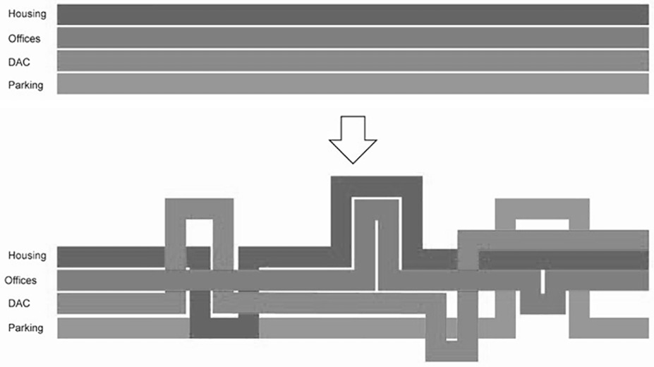 Его первый теоретический опыт – книга «Нью-Йорк вне себя» стал бестселлером и обязательным для прочтения архитекторами и урбанистами [5]. Книга, как и дипломная работа, представляет собой монтаж эпизодов, но Колхас добавляет и новый смысл: части книги он рассматривает как блоки Манхэттена, в каждом из которых разыгрывается своя история. Это также похоже на альманах, состоящий из короткометражек, в каждой из которых рассматривается тот или иной аспект темы. Тема «Нью-Йорка» – это ретроактивный манифест города, который был создан рыночными силами и технологическим прогрессом. Колхас анализирует итоги такого развития: сверхплотность, разнообразие и культуру Величины, создающие смысл феномена современного урбанизма – манхэттенизма. Несколько тем-концепций Колхас излагает в качестве теорем Величины: разрыв экстерьера и интерьера, новое качество пространства, определяемое лифтом, коллективное проектирование, автономию Величины по отношению к окружению и ее индифферентность по отношению к морали. «Город в городе» можно понять и спроектировать только через вертикальный разрез, поскольку именно эта проекция дает представление об устройстве объекта, в то время как оболочка призвана быть лого на урбанистическом горизонте. Вертикальный разрез становится диаграммой, визуализирующей сценарий, в то время как пространственные отрезки представляют собой эпизоды. Вертикальный разрез также обязан вертикальному монтажу Эйзенштейна и кинематографическому бэкграунду архитектора.