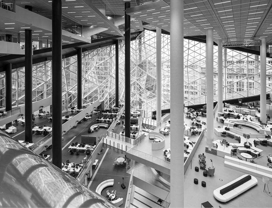 Кампус Акселя Шпрингера, крупнейшего издательского концерна, в Берлине (2020 г.) (рис. 5), представляет собой новую версию пространства работы. Цифровые технологии изменили суть офисной рутины, создавая закрытость и одиночество работника, погруженного в виртуальное пространство плоского экрана. Так же, как и библиотека, с точки зрения ОМА, офисное пространство нуждается в переосмыслении и трансформации. Трансформация должна заключаться в первую очередь в изменении пространственной структуры, которая должна изменить восприятие резидентов и минимизировать последствия экранного фокусирования. Диагональный атриум, пересекающий все здание, превращает офис Шпрингера в невероятное по своей сложности, плотности и разнообразию пространство работы. Террасные этажи определяют различные точки обзора и панорамы, создавая ощущение современного Вавилона, в котором каждый цифровой номад может найти пространство для работы и общения. Одновременность индивидуального и коллективного в структуре офиса, открытость первого уровня для различных городских событий, бар на крыше, с которой можно наблюдать городскую жизнь, делают утилитарное здание новым городским центром, транслирующим современную медиакультуру.