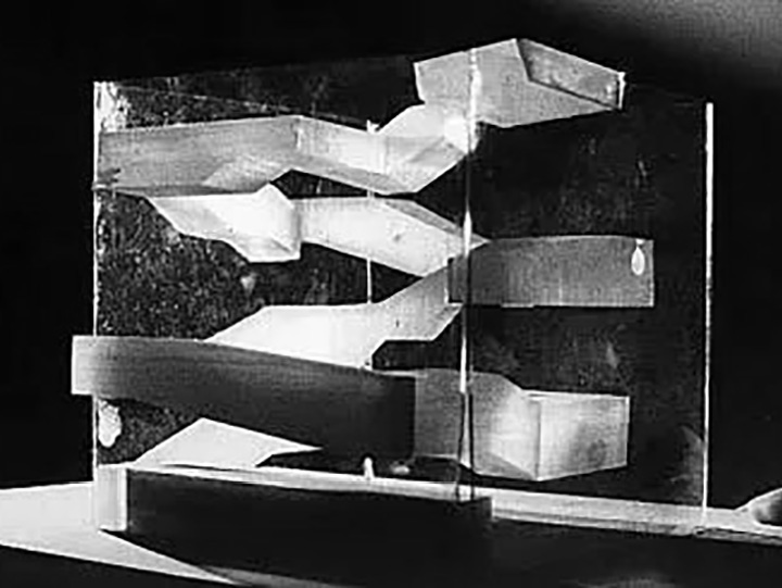 В патенте «Loop-trick» Колхас предлагает «систему пересекающихся рамп, которые уничтожают статус отдельного этажа…, устраняя понятия выше и ниже» [8]. Этот патент был реализован в проекте Кунстхала в Роттердаме (1987 г.) (рис. 6). Здание было задумано как перекресток/площадь между северо-южным и восточно-западными путями. К ним добавляется северо-восточное направление, усиливающее пространственную сложность. С одной стороны, здание выходит на шоссе, с другой – в музейный парк. Разные отметки высот на участке позволили создать пространственный узел, в котором все четыре части объекта были объединены непрерывным путем, проходящим через множественные коллизии подъема и спуска. Посетитель может пройти все программные части здания – выставочное пространство, зрительный зал и далее на крышу здания. Абстрагируясь от функций внутри объекта, можно представить, что перед нами аналог транспортной многоуровневой развязки – оммаж Райту.