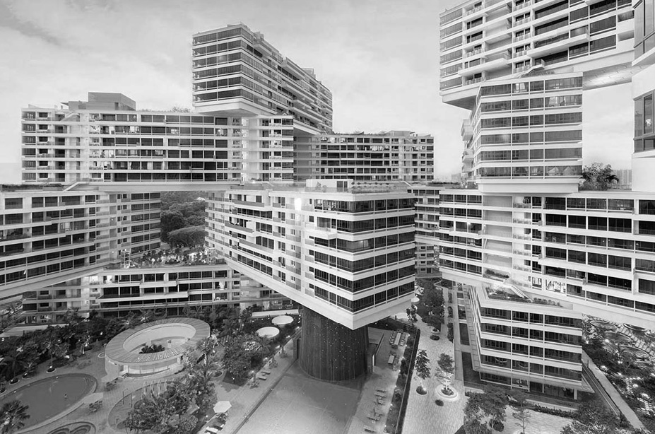 Подобная неопределённость формы, ее неустойчивая геометрия присуща и башне CCTV (2012) (рис. 15) [13]. Здесь Колхас также стремился преодолеть типологические стереотипы. В данном случае он предлагает концепцию Гипербилдинга, форма которого может быть абсолютно любой. Здесь форма представляет собой результат синтеза двух башен, расположенных наклонно и связанных на уровне земли и неба. Суперпетля отдалённо напоминает китайский иероглиф, но только отдаленно, не указывая впрямую на тот или иной конкретный знак. Колхас предпочитает избегать банальности и узнаваемости традиционных типов. Кроме CCTV примером типологического парадокса является Интерлейс в Сингапуре (2013 г.) (рис. 16). Интерлейс – это «вертикальная деревня», состоящая из 31 жилого дома, которые переплетаются между собой. Не существует прецедента, который мог бы быть применен здесь. Горизонтальные блоки чередуются с открытыми пространствами. Весь объект, напоминающий скульптурную сетку, можно также отнести к изобретенному Колхасом типу – Гипербилдингу.