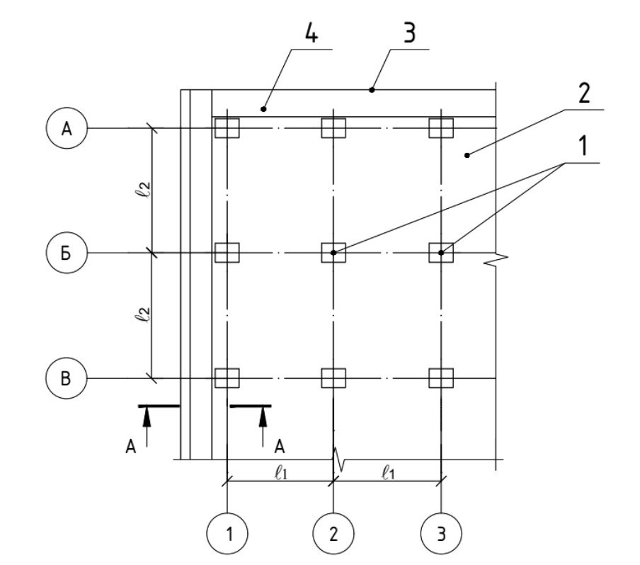 Рис. 1. Фрагмент плана железобетонного монолитного безбалочного бескапительного перекрытия здания: 1 – колонна; 2 – плита перекрытия; 3 – наружная грань; 4 – стеновое ограждение; ℓ₁ и ℓ₂ – соответственно пролеты плиты в коротком и длинном направлении, мм