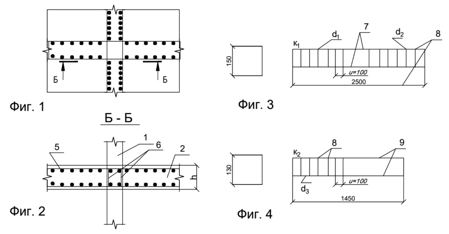 Рис. 3. Расположение плоских арматурных каркасов в узле сопряжения монолитной плиты безбалочного бескапительного перекрытия с колонной: план (фиг. 1) и разрез Б – Б (фиг. 2); конструкции плоских арматурных каркасов К1 (фиг. 3) и К2 (фиг. 4): 1 – колонна; 2 – плита перекрытия; 5 – каркас К1; 6 – каркас К2; 7 – продольные стержни диаметром d₁ арматурной сетки каркаса К1; 8 – поперечные стержни диаметром d₃; 9 – продольные стержни диаметром d₃ арматурной сетки каркаса К2; и – шаг поперечных стержней; h = 200 мм – толщина монолитной плиты