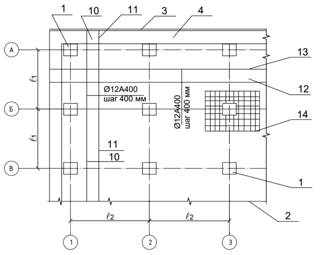 Рис. 4. Армирование монолитного безбалочного бескапительного перекрытия: 1 – колонна; 2 – плита перекрытия; 3 – наружная грань плиты; 4 – стеновое ограждение; 10 – продольные стержни нижней арматурной сетки; 11 – продольные стержни верхней арматурной сетки; 12 – поперечные стержни нижней арматурной сетки; 13 – поперечные стержни верхней арматурной сетки; 14 – дополнительная арматура в опорной зоне; ℓ₁ и ℓ₂ – шаг колонн в продольном и соответственно в поперечном направлении, мм; ∅12 А 400 – диаметр рабочих стержней арматуры класса А 400